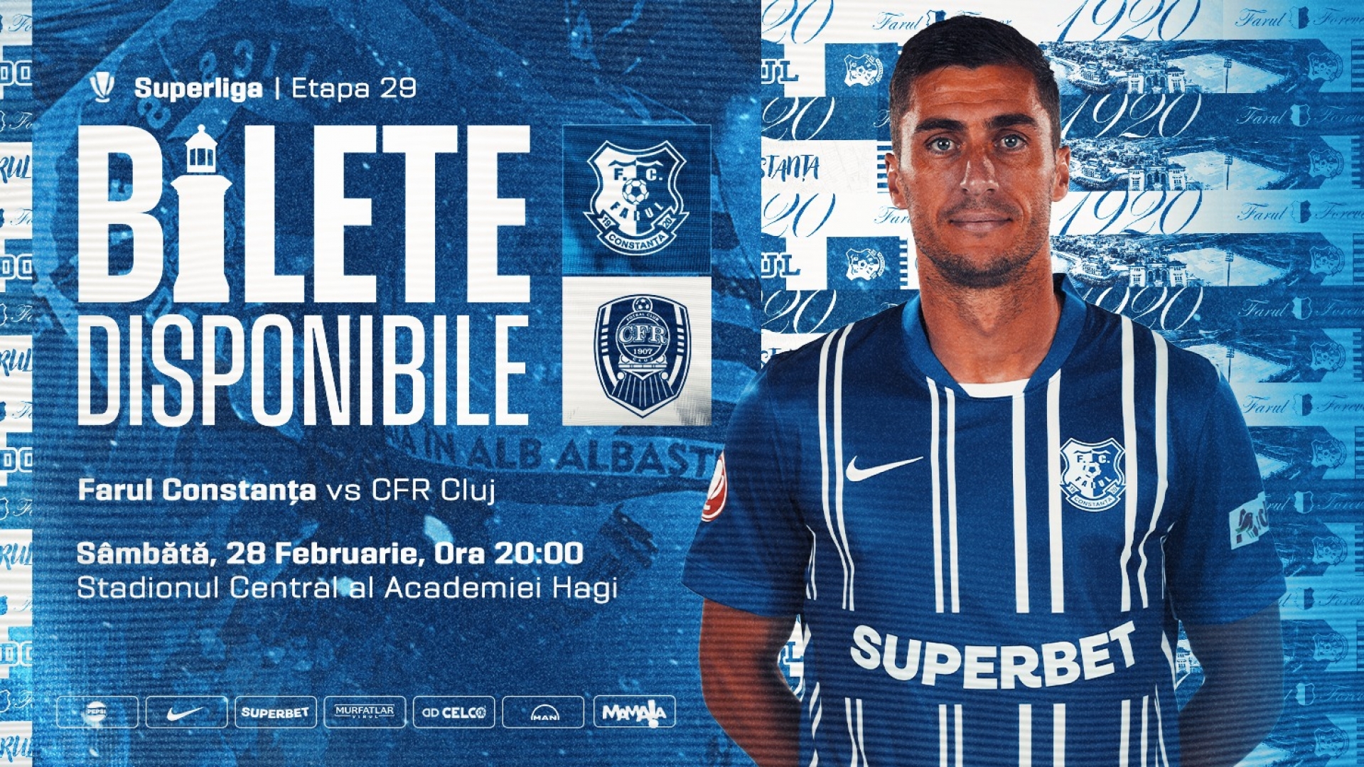 Sâmbătă, 28 februarie, de la ora 20:00, echipa noastră va juca împotriva celor de la CFR Cluj, în etapa a 29-a a Superligii. Meciul va avea loc pe Stadionul Central al Academiei Hagi.